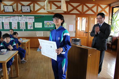 今年度は、1年生1名、2年生5名、3年生5名、4年生5名、5年生3名、6年生7名の子どもたちが、各担任の先生から受け取りました。