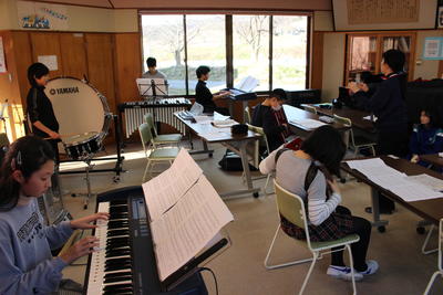 卒業式の入場曲「威風堂々」を準備していた5年生が、6年生の前で演奏しました。