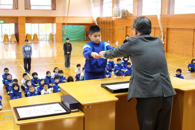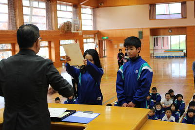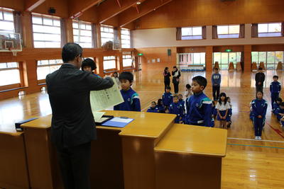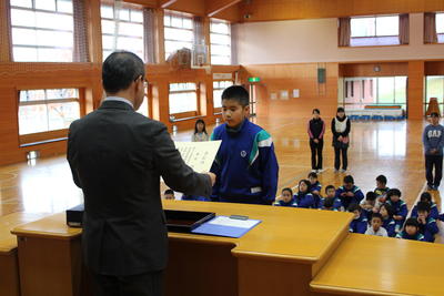 全校朝の会で、各種コンクール等でいただいた子どもたちの賞状を披露しました。