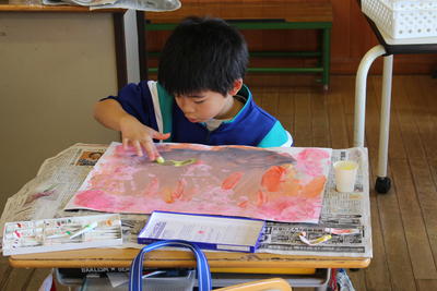 2年生は図工の時間に、どろどろ絵の具を使って画用紙に色を塗りました。
