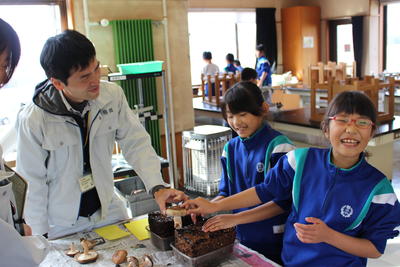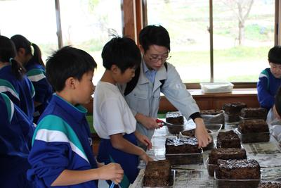 3・4年生は総合的な学習の時間の森林環境学習の一環で,しいたけ栽培に挑戦します。