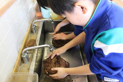 話を聞いた後は,図工室に移動して,しいたけを栽培する菌床の準備を行いました。
