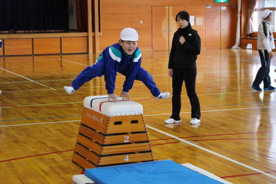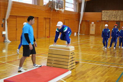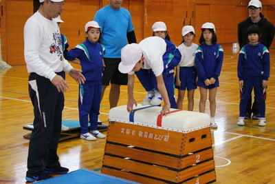 今日、小学校体育専門アドバイザーの先生から、とび箱のとび方のコツを教えていただきました。