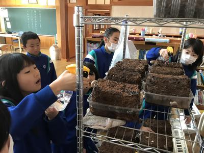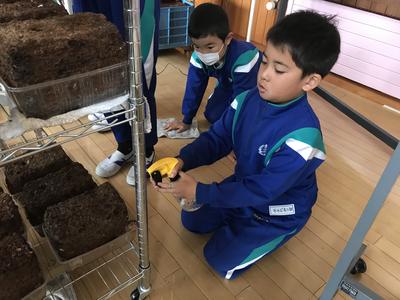 3・4年生が総合の学習で進めているしいたけ栽培。