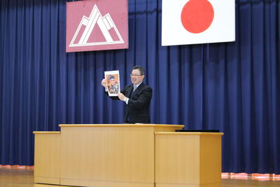 今日の全校朝の会で、校長先生が やなせ たかし さん のお話をしました。