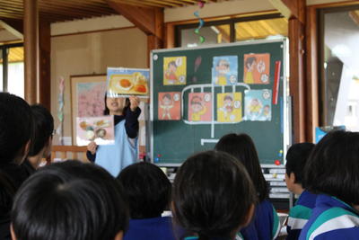 給食の時間、栄養教諭の先生から「よくかんで食べることの大切さ」についてのお話がありました。