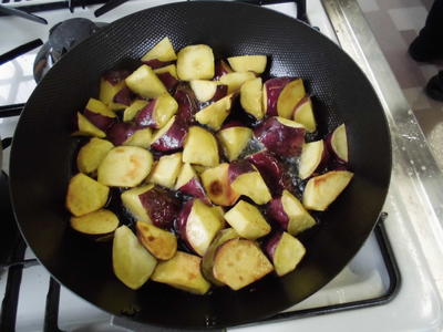 さつまいもを切って、油で揚げ、砂糖と醤油とみりんに蜂蜜を入れてからめました。