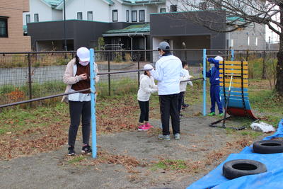 今日、健康体育委員会の子どもたちが、校庭の鉄棒とブランコなどの片付けを手伝ってくれました。