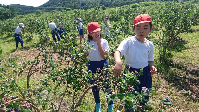 おいしいブルーベリーの見分け方を教えてもらう子どもたち 甘いブルーベリーが見つかるといいね