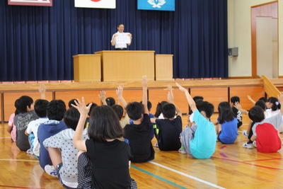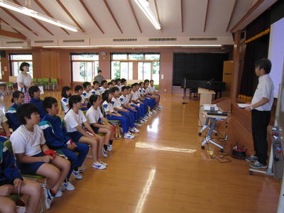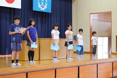 各学年の代表の子どもたちが、みんなの前で「1学期の反省」「夏休みに頑張りたいこと」について話しました。