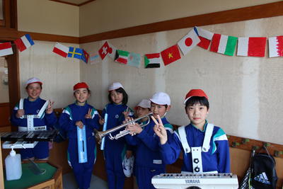 4年生が万国旗をつくり、玄関に掲示してくれました。