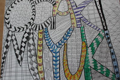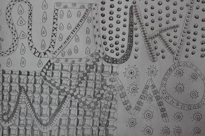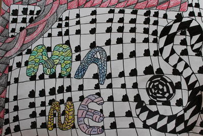 6年生の教室に、図工の時間に描いた模様が掲示してあります。