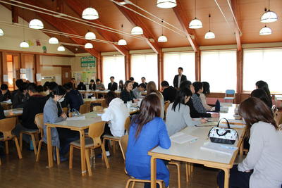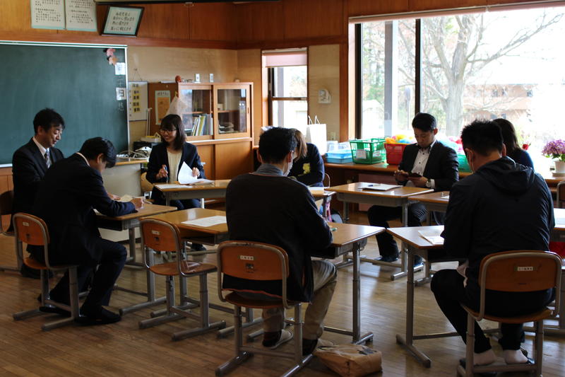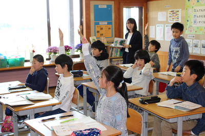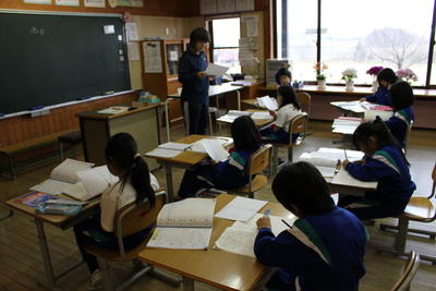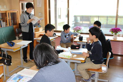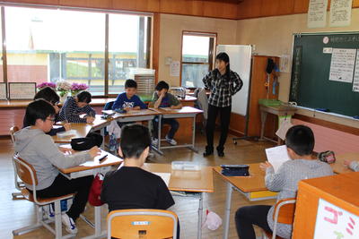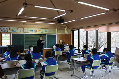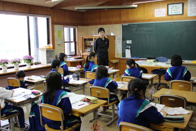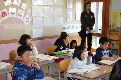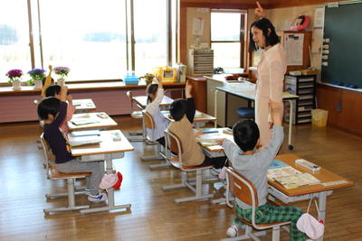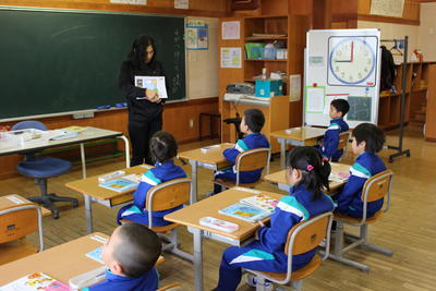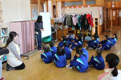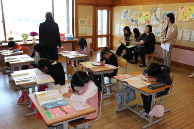 幼稚園の先生と町が方々が、1年生の学校生活の様子を見に来ました。