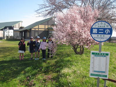 咲き始めた桜の花を見て、子どもたちもうれしそうです。