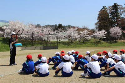 子どもたちは桜の木の下で遊んだり、桜の花を見ながら体育したりしています。