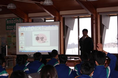 教頭先生から、このようなお話を聞いたあと、みんなで「幸せって何なのか」を考えました。
