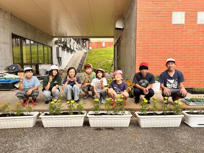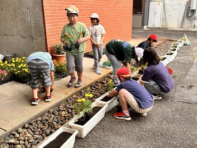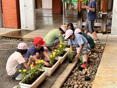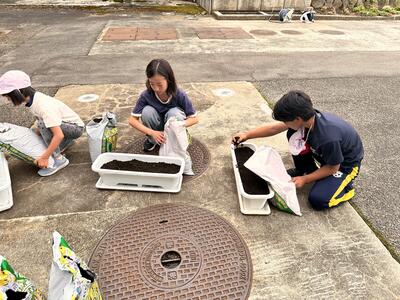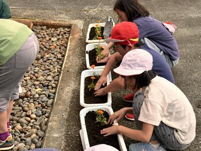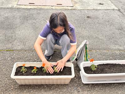 環境委員会は、プランターにマリーゴールドを丁寧に植えていました
