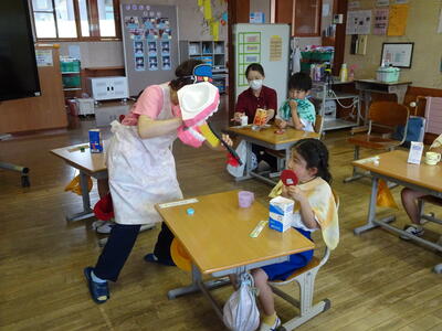 授業参観の後は、各学年の教室で一緒に給食を食べました
