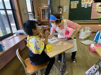 給食を食べながら、「今は合奏を頑張っているんです!」や「朝ごはんは毎日食べてきます。」などと、磐梯大学の皆さんと子どもたちも交流ができたようです。