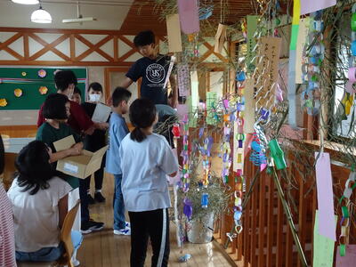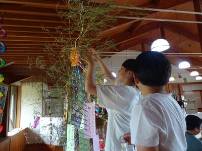 今日は、5・6年生が集会室の笹に七夕飾りを付けました。みんなで協力して活動している姿に、なんとも微笑ましく、温かい気持ちになりました。