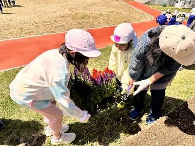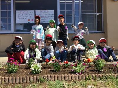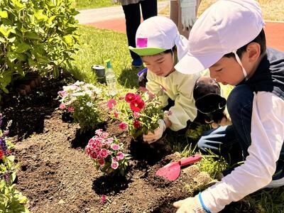 6種類の花の説明をしたり、植え方の説明をしたりして年長さんと協力して植えることができました。きれいな花壇になり、夏を迎えるのが楽しみになりました。
