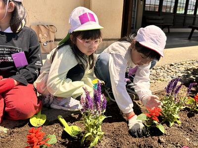 今日は3年生が磐梯幼稚園へ行って、年長さんと一緒に花を植えてきました。