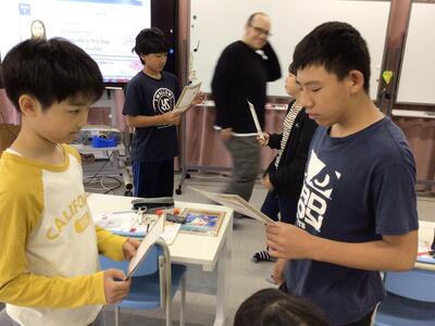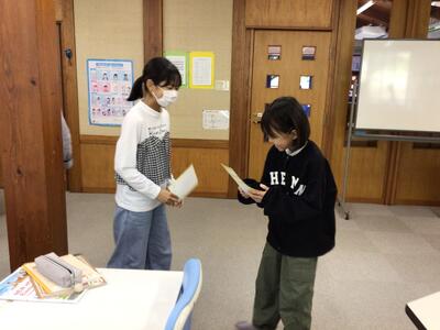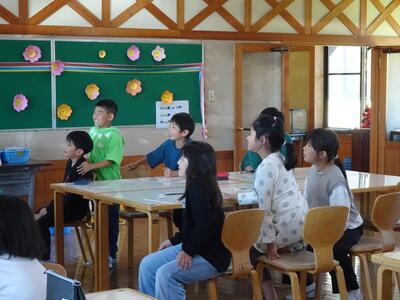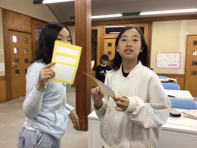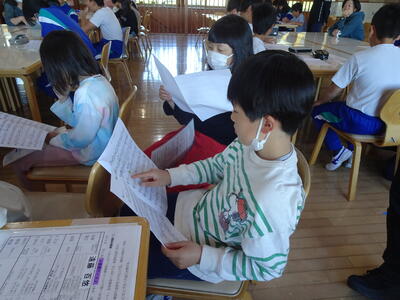 5年生は、自分の名前と好きなものをカードにかき、いろいろな友達と自己紹介をしました。言葉を確かめながら話したり、友達の紹介を一生懸命聞いたりしました。