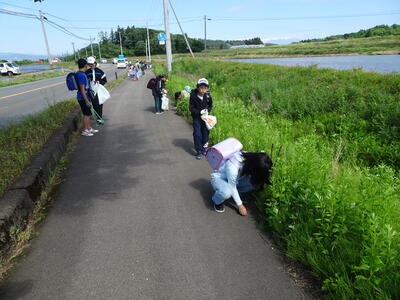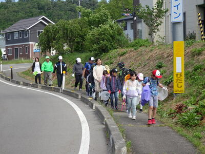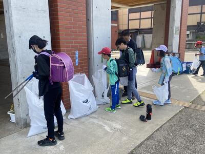 地区ごとにいつもの集合場所に集まり、見守り隊や保護者の皆様と一緒に、自分の地域をきれいにしながら登校しました。