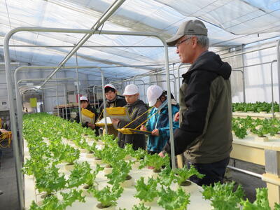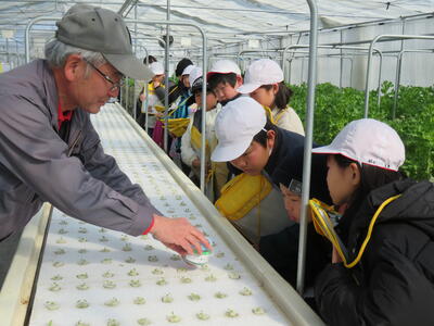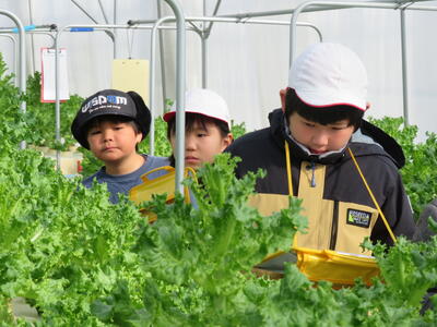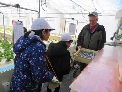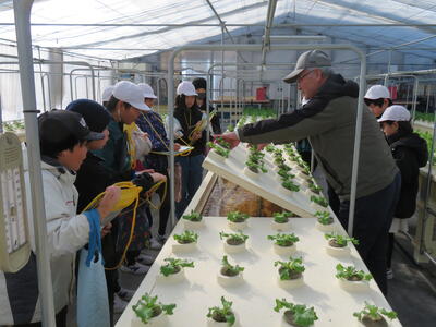 今日の2~3校時に4年生がリーフレタスの水耕栽培見学に行ってきました。