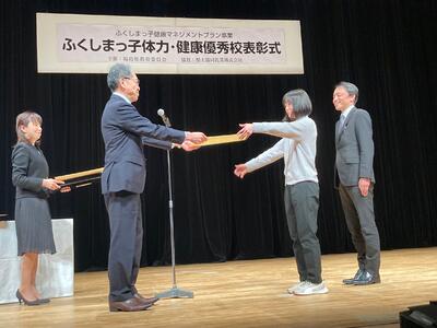 2月13日(火)に福島市で行われた表彰式に参加してきました。長なわとびの4冠と食育の最優秀校ということで、各方面からたくさんのお褒めの言葉をいただきました!