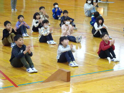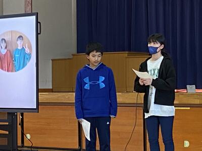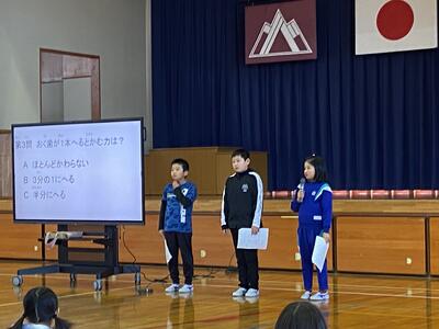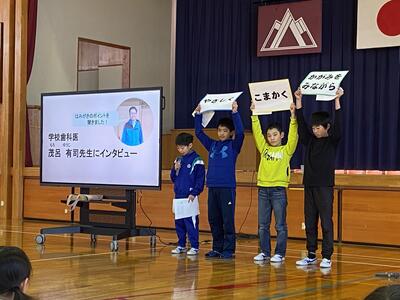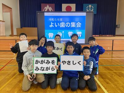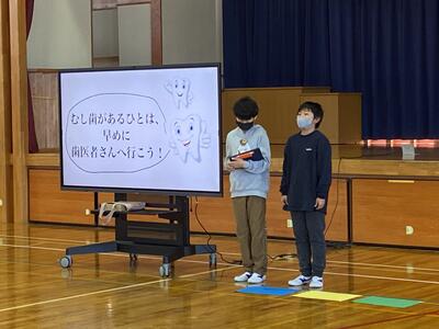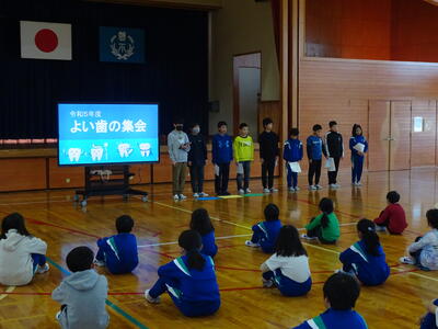 集会では、6年間むし歯のない6年生にインタビューをしたり、学校歯科医の先生から教えていただいたむし歯予防の歯みがきのポイントを全校生に伝達したりしました。