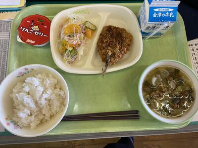 メニューは、アジフライ、シルバーサラダ、具だくさん汁、りんごゼリー。