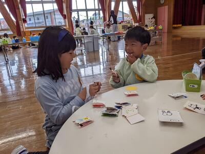 いつもは、中学年や高学年のお兄さんやお姉さんにいろいろやってもらっている2年生も、幼稚園の子たちから見ると立派なお兄さんお姉さんです。小さい子たちのために名前を書いてあげたり、遊び方を教えてあげたり、たくましく成長した姿が見られました。