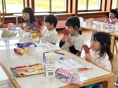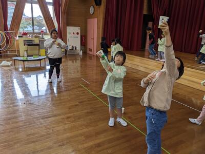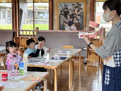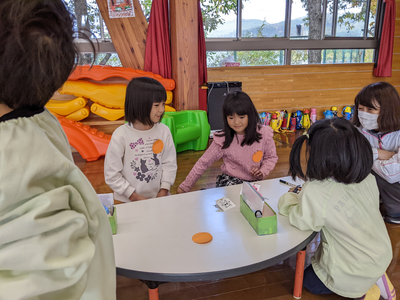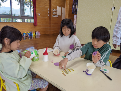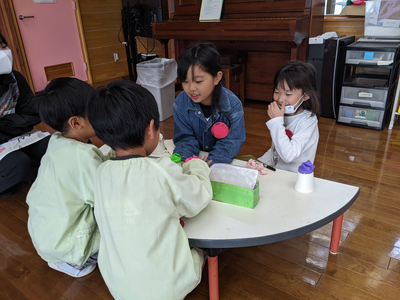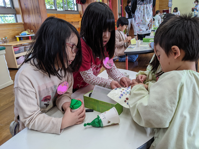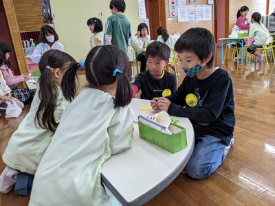 今日は、2年生と幼稚園の子どもたちとの交流活動体験「つくってあそぼう」が幼稚園で行われました。2年生が生活科で作ったおもちゃに、幼稚園の子どもたちと絵を描いたりシールを貼ったりして完成させた後、いっしょに遊びました。
