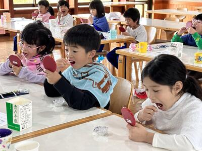 今日のお昼休み、低学年の「歯みがき教室」がありました。養護教諭から、6歳臼歯についてや歯みがきの仕方を教わりました。今日は染めだしをを行って、食後の歯みがきの仕方を確認しました。磨けていると思っても、歯と歯の間や、歯の内側など赤く染めだされたところを見て「もっと気をつけて磨かないと・・・」と反省する声が聞かれました。