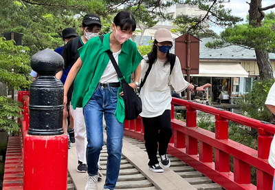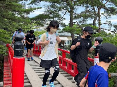 松島に無事到着。集合写真も海がきれいに見える中、撮影することができました。五大堂へ向かう赤い橋は隙間が多いので、足元をよ~く見ながら慎重に…。ガイドさんの説明を聞きながら見学しました。