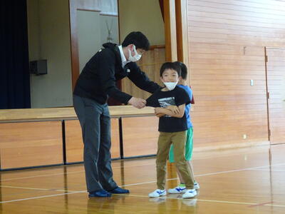 終了後、不審者が近づいてきたときの対応について警察の方からお話を聞きました。「いか(ない)、の(らない)お(大声を出す)す(ぐにげる)し(らせる)」が大事です。みんなで、「たすけて~」と大声を出す練習をしたり、実際に不審者が近づいてきた時に大声を出して逃げる練習をしたりしました。