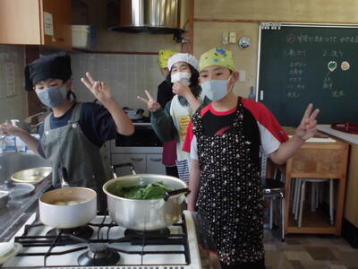 今日の3・4校時に家庭科の学習で5年生が調理実習を行いました。
