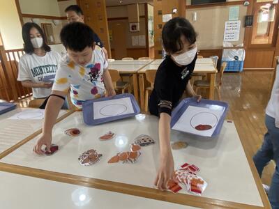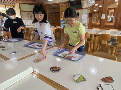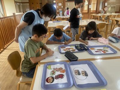 調理場の栄養教諭の先生と一緒に、自然教室に向けたバイキングの練習を通して、バランスのよい食事について学習しました。