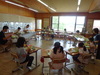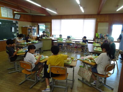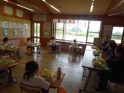 授業参観の後は、各学年の教室で一緒に給食を食べました