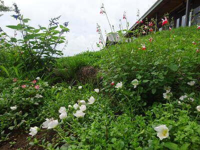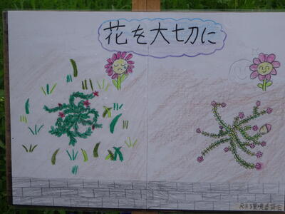 環境委員会が作成した看板も設置され、赤やピンク、黄色に白、青・・・等などの花、花、花。今、見頃です